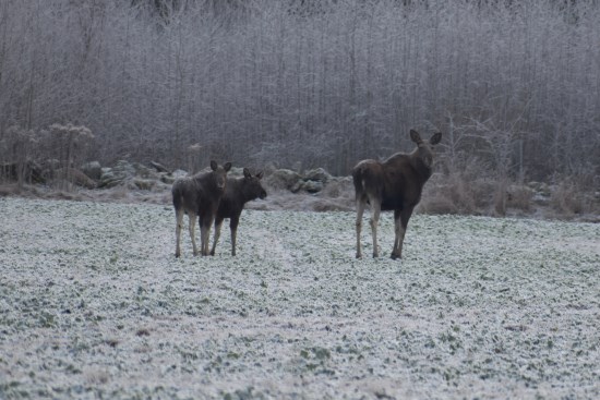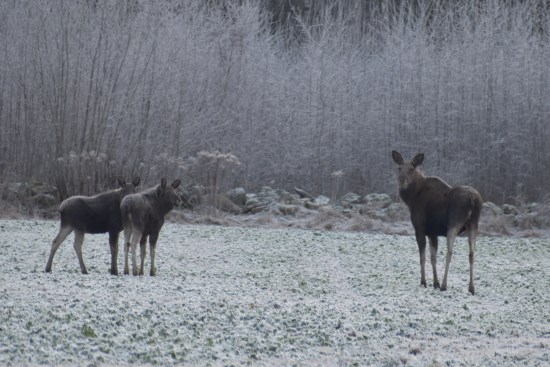 Det uppehåller sig ofta ett gäng älgar på ett gärde jag passerar fyra gånger om dagen. För det mesta är det för mörkt för att fota dem men igår fick jag några bilder, om än på långt håll :)