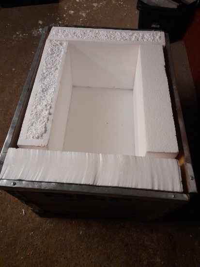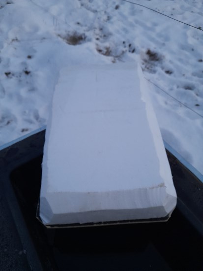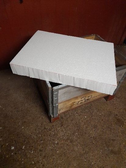 Skär till cellplast i lämplig storlek. Bottenplattan skall täcka hela botten. Sidoskivorna ställs på bottenplattan utmed alla fyra sidor.