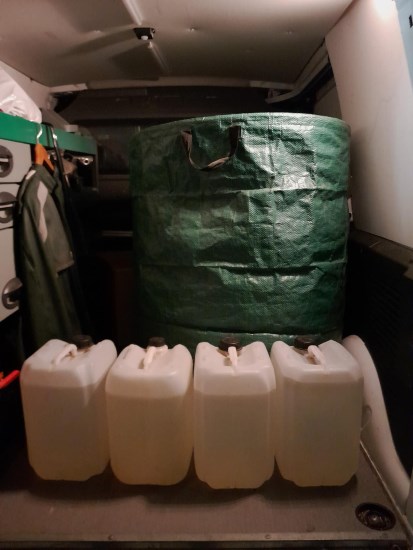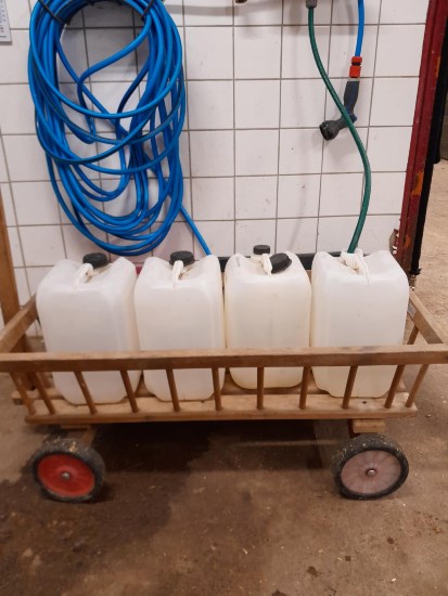I somras vattnade jag i hagarna med slang. Det tar en kvart att fylla en stor balja eftersom slangen är väldigt lång. Jag har, åtminstone nu inför höst och vinter, övergått till att fylla dunkar och köra ut, det går snabbare. Till hagen längst bort lastar jag i bilen, som jag nyss berättade. Till de närmaste hagarna kör jag i barnens gamla skrinda. Det var ju bra att den har fått en uppgift igen efter många år som helt oanvänd :)