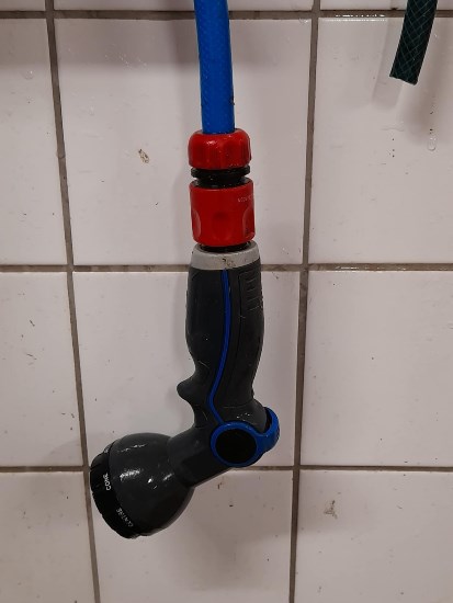 Man behöver mycket saker i ett stall och jag handlar mest på Biltema och Jula. Slangmunstycket med olika strålar har jag tex köpt på Biltema för ca 100 kr. När jag vattnar i hinkarna i boxarna använder jag duschstrålen och när jag tvättar foderbaljor sprutar en stark stråle enkelt bort resterna.