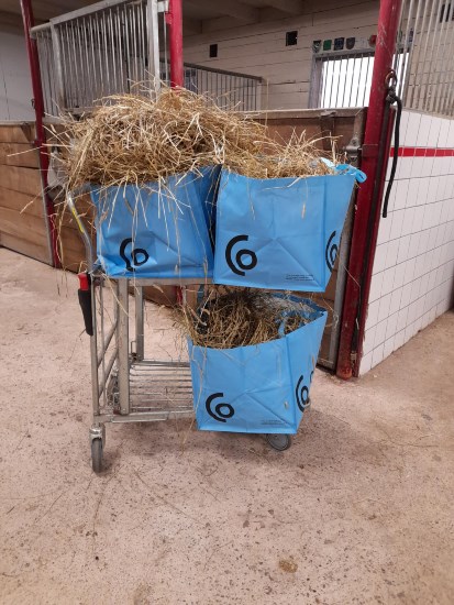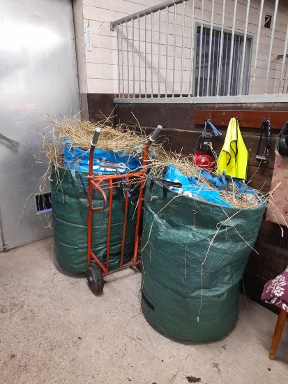 Jag förbereder allt grovfoder dagen före eftersom det måste gå smidigt på mornarna innan jag skall till jobbet. När jag packar hö till hagarna använder jag lövkassar köpta på Jula. De rymmer 300 liter, kostar ca 80kr och håller i många år. Jag har en mängd sådana säckar som jag använder till allt möjligt annat också såsom återvinning och samlande av plasten från hösilaget. Den här rutinen behöll jag från gamla stallet, den är väl inarbetad och fungerar mycket bra.