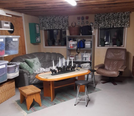 Sadelkammaren är på ca 26 kvm och där möblerade jag nyligen om lite. Jag tycker det blev trevligare att ha soffan på snedden än mellan fönstren. Jag är i stallet många timmar varje dag så där äter jag i stort sett dagligen. Jag har en vattenkokare som jag tror Elein vann vid en utställning för många år sedan. Jag skall även skaffa en micro så det går att ta med middag.